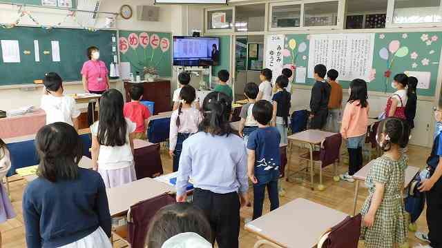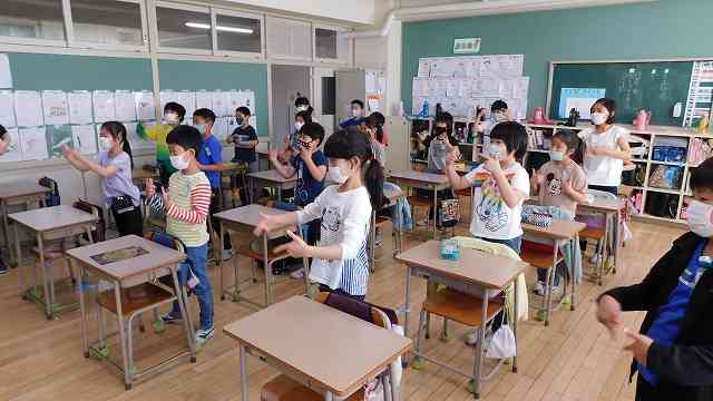 4月22日(木) 今日は音楽朝会を行いました。実に14ヶ月ぶりくらいだと思います。昨年度は、様々な制限の中で音楽の授業を行っていました。全体で集まることはできないので集会的な活動は中止になっていました。今回も集会という形ではできませんが、テレビ放送を使って、各教室で全校児童がテレビを見ながら参加するという方法ならできます。今回は、音楽室にカメラ機材を運び、音楽室から中継をしました。音楽専科が、歌の体操と校歌の指導、そして、校歌の手話を教えて、大きな声で歌えない分、手話も付けてみんなで校歌を表現しました。それぞれの教室でみんな真剣に参加していました。【添付ファイル】