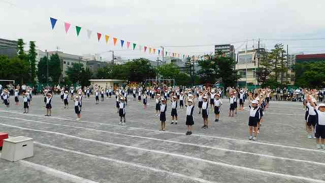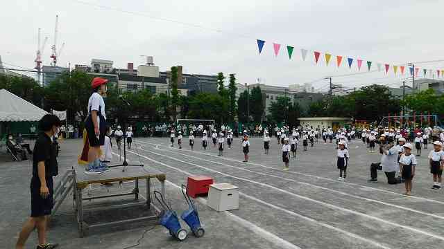 5月29日(土) 今日は運動会。天気は午前中は曇りで暑くなくちょうど良い運動会日和でした。 今回は緊急事態宣言下のため、参観は保護者のみとし、1・2年 3・4年 5・6年 に分けて三回の入替え制としました。受付ではサーモグラフィーによる検温、手指の消毒にご協力いただき、PTA役員の皆さんが受付をしてくださいました。 保護者の皆様には、参観の流れにご理解ご協力いただきましてありがとうございました。 1・2年生のみ校庭に出ての開会式。1年生のはじめの言葉も立派でした。他の学年は教室でテレビ放送を見ながら参加しました。 プログラム1 全校体操(ラジオ体操)は各教室でもテレビを見ながら一緒に体操をしました。【添付ファイル】