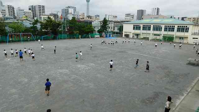 9月8日(水) 緊急事態宣言下で、感染症対策を強化するために、休み時間は校庭を二分割して、他学年が交わらないように遊んでいます。校庭の真ん中に白線が引いてあります。見えないバリケードです。