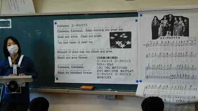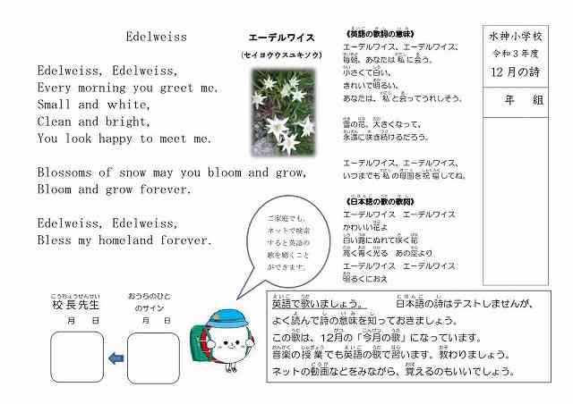 12月9日(木) 水神小学校では、全校で詩の暗唱に取り組んでいますが、12月は英語の詩(歌)にしています。そして、今月の歌とコラボしています。今月は、映画「サウンド・オブ・ミュージック」の中の曲の一つ「Edelweiss」です。全学年が音楽の授業で英語の歌詞で歌を教わっています。今日は3年生の教室で音楽の授業があり、みんなで歌を歌っていました。また、校長室にはすでに覚えた1年~6年生の子たちが、やってきて歌っています。みんな覚えて合格を目指しています。【添付ファイル】