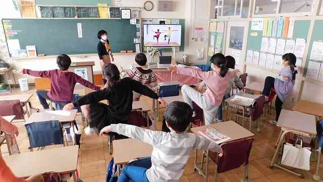 2月17日(木) 今日は体育朝会がありました。今回もテレビ放送で行いました。各教室でストレッチ運動の動画を観ながら、関節を動かしたり、筋肉を曲げ伸ばししたり、室内でもできる運動を体験しました。こどもたちは、テレビを観ながら楽しそうにやっていました。