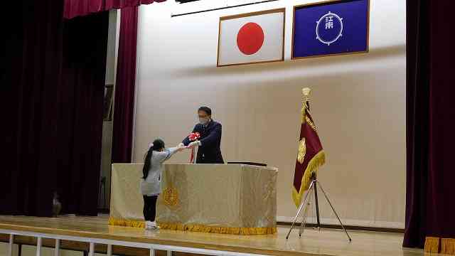 3月24日(木) 今日は修了式。体育館で全校児童が集まることはできませんので、体育館からテレビ放送をしました。各学級代表が修了証を授与しました。また、「詩の暗唱」で一年間全ての詩を覚えて合格した人に「詩の暗唱パーフェクト賞」が授与されました。 校長先生の話では、1月31日の全校朝会で紹介した「冬芽」の話の続きがありました。「校舎裏にあるハクモクレンにきれいな花が咲きました。二ヶ月前にまだ小さかった冬芽が、樹が栄養を作ったことで、冬芽も大きくなって花になったのです。この一年間、みんなが授業やオンラインで学んできたことや、たくさん体を動かして丈夫な身体を作ってきたことが、また新しい学年に向けての力になるのです。そうして、また来年度もまた頑張って、また一年後に素敵な花を咲かせること、それが成長するということです。」 最後に、校歌を歌いました。【添付ファイル】