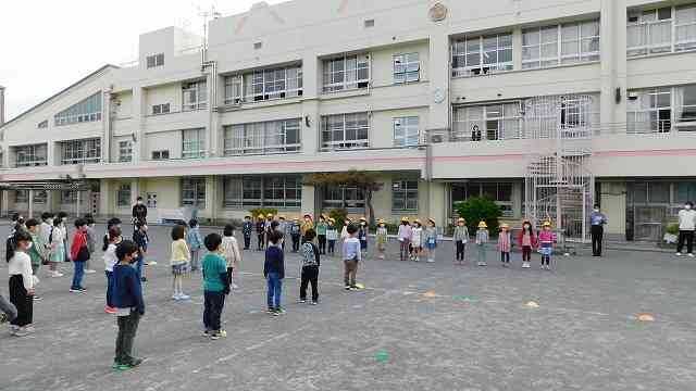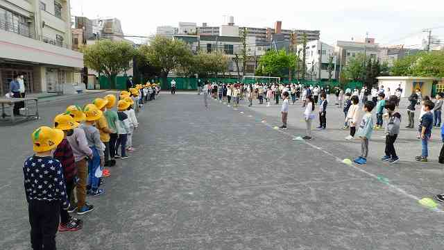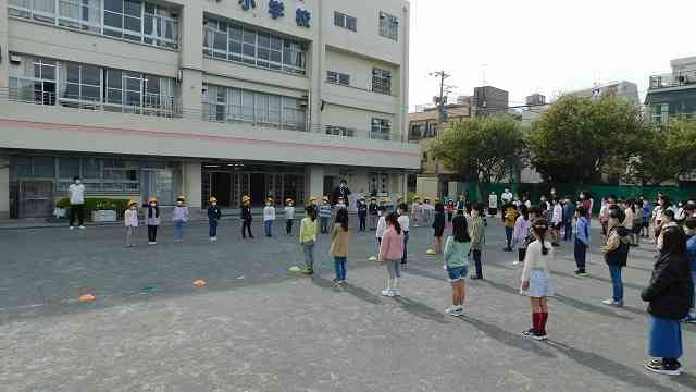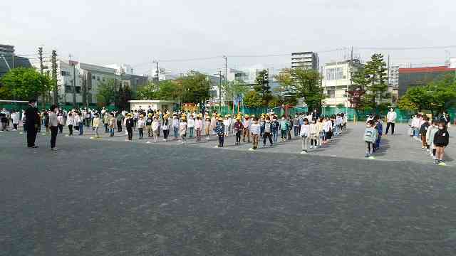 4月18日(月) 今日の全校朝会の前に、対面式がありました。1年生二クラスのかわいい仲間の顔合わせがありました。1年生にとっては広い校庭で初めての朝会です。大勢で並ぶのも初めてです。児童代表の歓迎の言葉の後、1年生が声をそろえて元気に応えてくれました。 まだ、緊張している様子が伝ってきましたが、すぐに慣れてお兄さんお姉さんと仲良くできることでしょう。