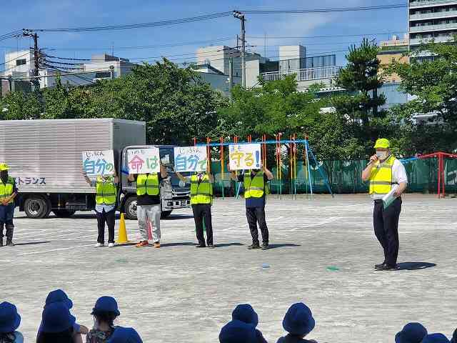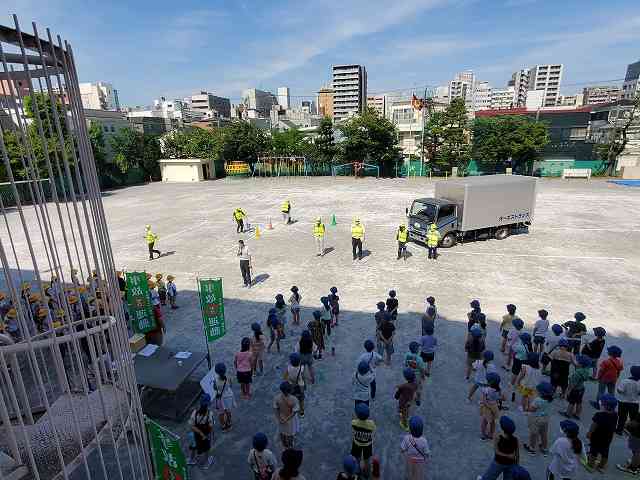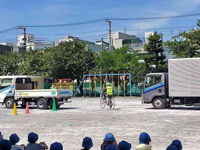 6月29日(水) 今日は交通安全教室がありました。1校時は1・3・6年、2校時は2・4・5年と2回に分かれて、同じ内容で行いました。東京都トラック協会城東支部の方が来てくださり、車の死角、横断歩道の渡り方などについて実際のトラックを使って説明してくださいました。 暑い日だったので、こどもたちは校舎の日陰で見ました。指導してくださった皆様、暑い(熱い)中ありがとうございました。【添付ファイル】