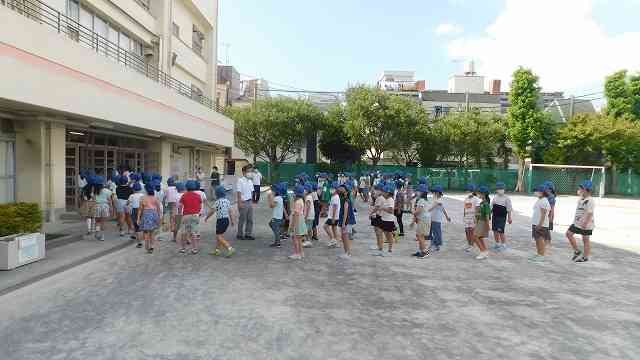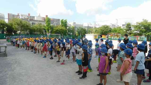 7月11日(月) 毎週月曜日は全校朝会があります。コロナ禍ではテレビ朝会でやるようにしていましたが、今年度は、校庭でできるときは、全校で集まるようにしました。それでも、月曜日に雨が降ることもあり、最近なかなか校庭で集まれませんでした。今日は、日差しがあり、熱中症にも気を付けなくてはいけない天気でした。そこで、水神小学校の校舎の影を利用しました。水神小学校の校舎は、東西に向いた建物で、朝は、校舎の影が校庭の4分の1ほど覆っています。こどもたちには、横に広がってその影に入って話を聞いてもらいました。 みんなが集まることで、テレビ朝会ではできない、こどもたちからのレスポンスがあります。今日は、それをメインにして、こどもたちにたくさん手を上げてもらいました。【添付ファイル】