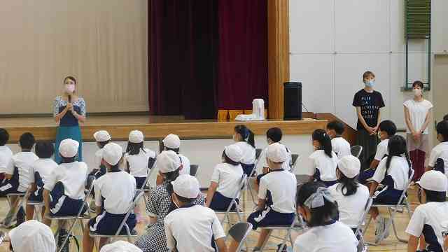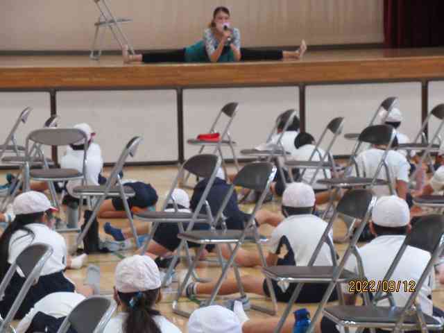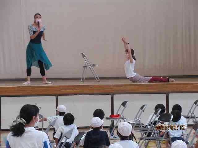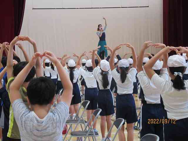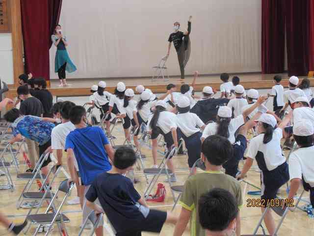 9月12日(月) 今日の2校時、4,5,6年生のバレエワークショップがありました。プロのバレエダンサーの方々が講師として指導してくださいました。 体育館に、間隔をとって並び、前後屈したり、脚を広げたり挙げたり、という柔軟運動をしました。 お手本の先生は、さすがバレリーナです。体がすごく柔かいです。同じことができるくらい体が柔らかくなるといいです。