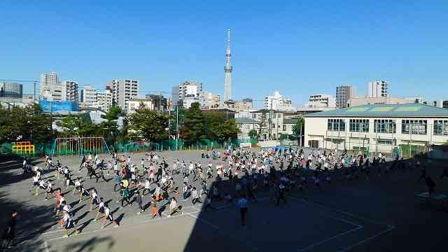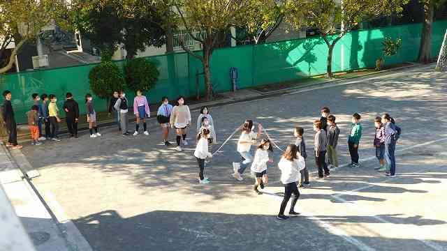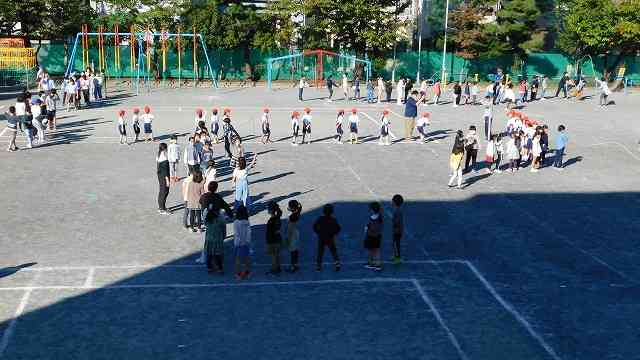 10月20日(木) 今日の体育朝会は、各学級ごとに長縄をしました。 秋晴れの清々しい青空の下、準備運動をしてから始めました。まだ、低学年には長縄を跳ぶタイミングがつかめない子もいますが、何度も練習してタイミングよく飛べるように頑張ってほしいです。