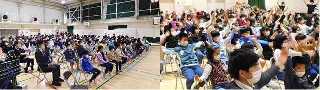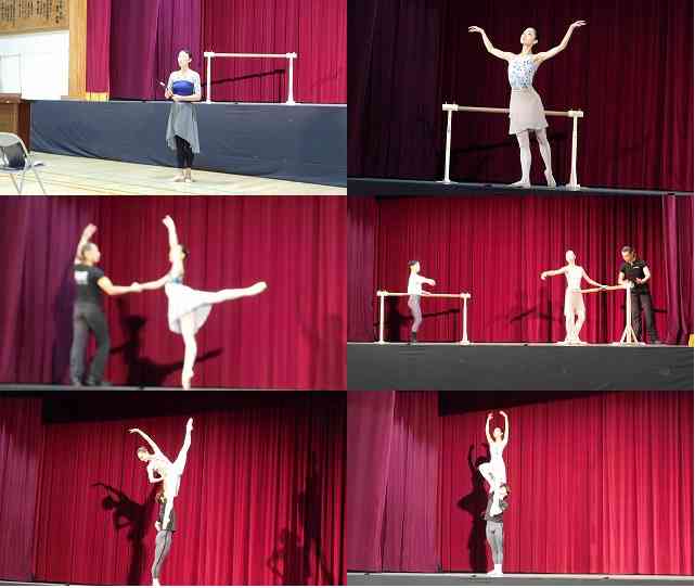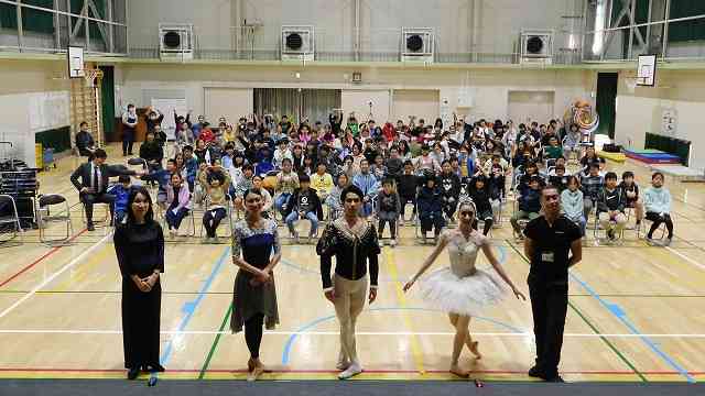 10月26日(水) 今日の5校時は、4,5,6年生が、体育館でバレエ公演を鑑賞しました。文化芸術による子供育成推進事業の巡回講演事業として谷桃子バレエ団によるバレエ公演です。 三つの学年が一緒に体育館で鑑賞するのも3年ぶりのことです。 公演の第1部は、実演と解説でバレエについて、歴史や練習方法、手や足の五つのポジションやマイム(ジェスチャー)についても詳しく教えていただきました。 第2部は、有名な「白鳥の湖」のハイライト版をみせていただきました。 体の柔らかさ、姿勢の良さ、優雅な動き、力強いリフトなど、間近で観られる機会は、めったにありません。とても貴重な時間を過ごすことができました。 最後に全員で記念撮影をしました。【添付ファイル】