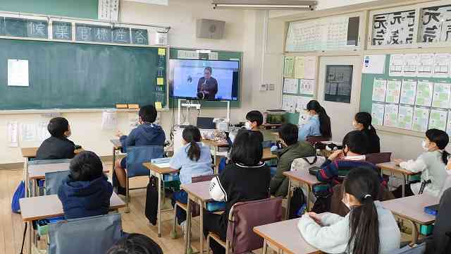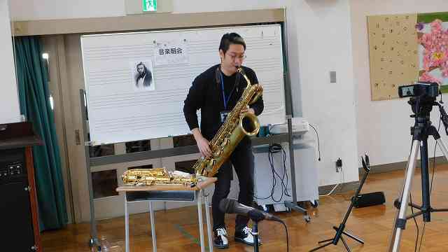 1月26日(木) 今日の音楽朝会は、テレビ放送で、新しい音楽専科の先生が専門にしている楽器サキソフォンの紹介をしました。 サキソフォンはサックスとも言います。実は、この楽器を考えたのはアドルフ・サックスという人なのです。金管楽器のようで実は木管楽器、ソプラノ、アルト、テナー、バリトンがあって、大きさが違って、大きいほど低い音が出ます。アルトサックスの指使いはリコーダーと同じなのです。 そして、バリトンサックスで、自身の作った曲を披露しました。【添付ファイル】
