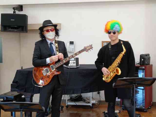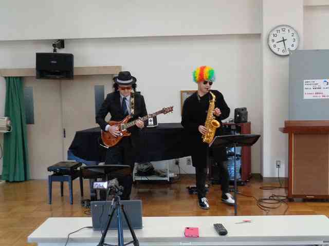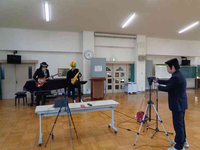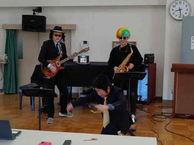 2月27日(月) 今日の全校朝会(テレビ放送)で、校長先生から「水神サンバの3番を英語の歌詞で作るので、その編纂委員を募集します。」というお知らせがありました。水神サンバは開校60周年を記念して作られた歌ですが、毎年、歌詞を作って加えています。昨年度は、こどもたちのアンケートを元に代表メンバーで話し合って2番を作りました。英語で歌詞を作ろうと思っています。 そのPRとして、なんと、サンバの国ブラジルから二人のミュージシャンが来て(という設定で)、サックスとギターで「水神サンバ」の演奏を聴かせてくれました。さらに、もう一曲おまけで「ルパン3世’78」も演奏してくれました。その曲の途中から、なんとカメラマンになりすましていたルパン3世本人も乱入して出演してくれました。。各教室でテレビで見ているこどもたちはとても喜んでくれたようです。 ちなみに、ミュージシャンはサックスはスカラムーシュさん、ギタ-はバンル・ウトイカさんでした。演奏が終わると、すぐに飛行機に乗ってブラジルに帰ってしまいました(という演出で・・)。【添付ファイル】