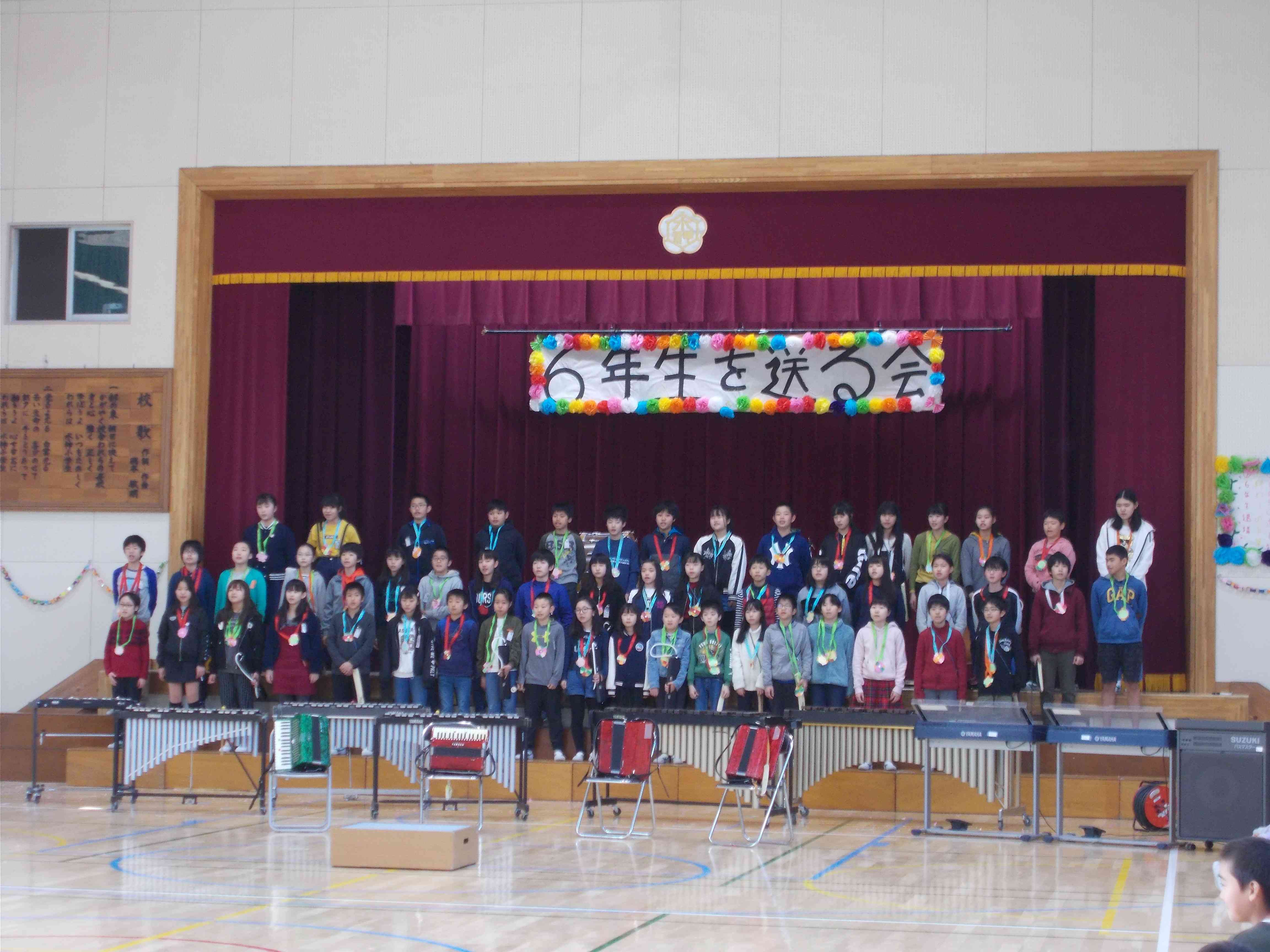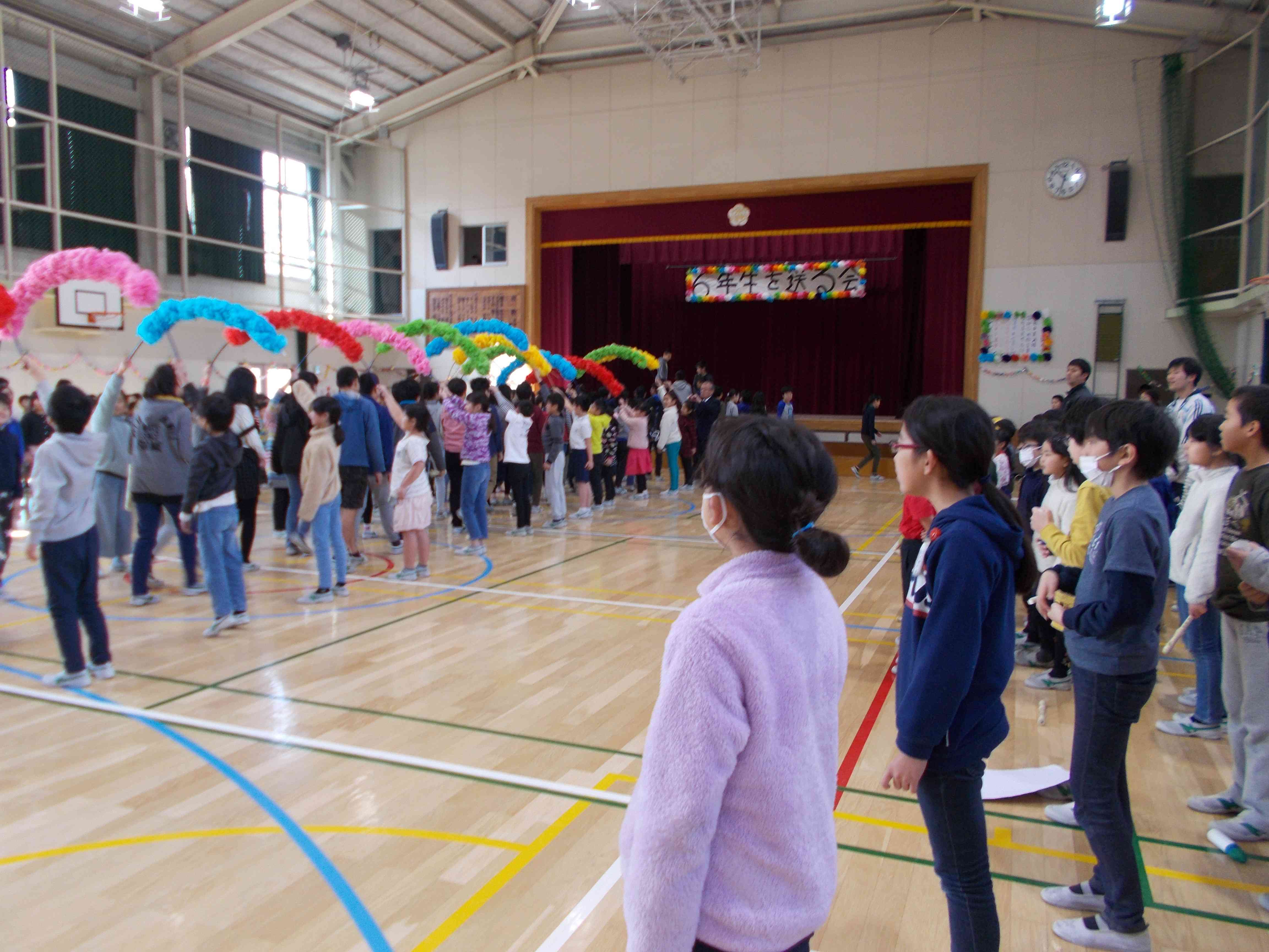 2月22日(金)に6年生を送る会とお別れ給食が行われました。装飾された体育館で、1~5年生が工夫を凝らした出し物を披露し、卒業をお祝いしました。6年生はお返しに、合奏と合唱を披露しました。心温まる素敵な会となりました。 お別れ給食は縦割り班に分かれ、異学年で給食を食べました。6年生に質問をしたり、メッセージを送ったりと楽しい時間を過ごしました。その後は、縦割り班で遊び、6年生との思い出をつくりました。