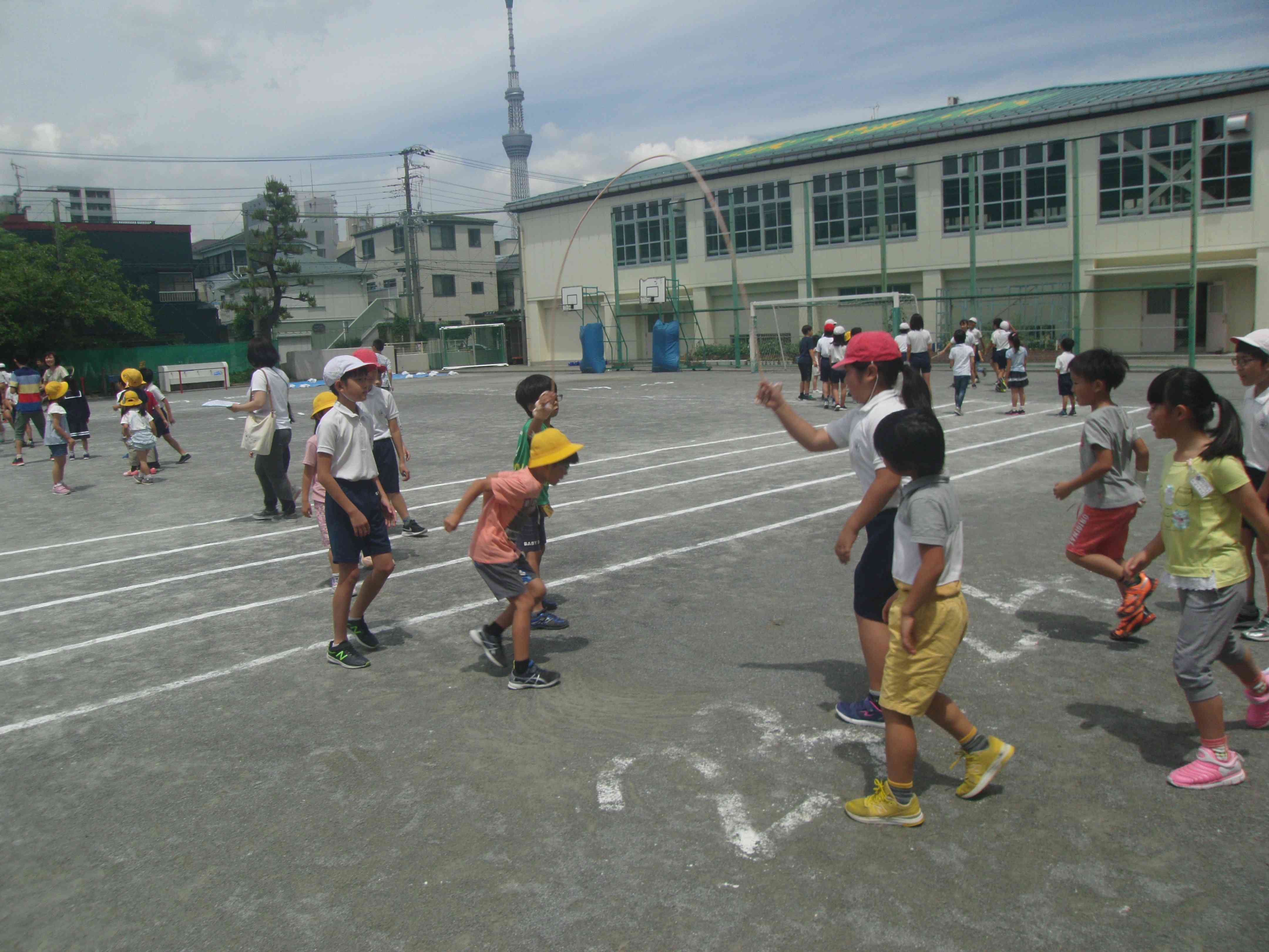 水神小学校では、1年間に12回なわとびタイムがあります。今回は休み時間に縦割り班で長なわをしました。