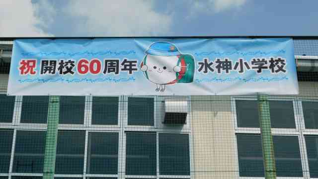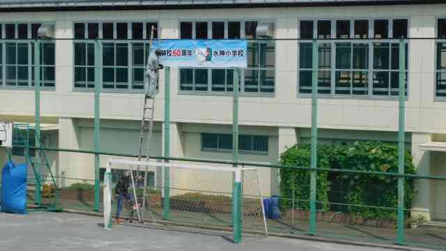 8月17日(月) 夏休みがもう半分過ぎました。今年は2週間あまりの短い夏休みです。それにしても連日の猛暑日で大変な暑さです。そんな中、地域の鳶職の方がご厚意で、校庭の防球ネットに開校60周年横断幕をつけてくださいました。かなり高い所なのでお願いしたところ快く引き受けてくださいました。大変暑い中、5m位のはしごの上での作業本当にありがとうございました。きっとこどもたちも喜びます。【添付ファイル】