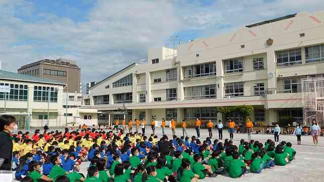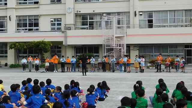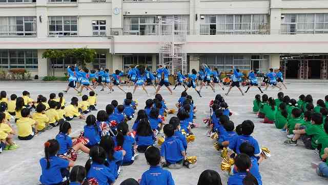 10月30日(金) (つづき)最後は5,6年合同。「Happy Birthday 水神小!!」です。四つのグループに分かれて、表現や演奏を披露しました。1番目のグループは、水神小の歴史や今の水神小学校の取組など調べたことを発表しました。2番目のグループは、今の5,6年生が中学年の頃、運動会で踊った「南中ソーランを」踊りました。気合いが入って全力で踊っていました。3番目のグループは、6年生が昨年度やった組体操の一人演技や3人扇などを披露しました。ただし今回の扇は手をつながないスペシャルバージョンでした。4番目のグループは合奏で「Happy Birthday」の曲をいろんなアレンジで演奏しました。水神小の60歳のお誕生日にふさわしい合奏でした。 各学年とも、今年度はじめての全校集まっての集会で、自分たちの出し物を披露できることが嬉しそうで,とても張り切っていました。天気にも恵まれ,いつまでも心に残る行事となりました。【添付ファイル】